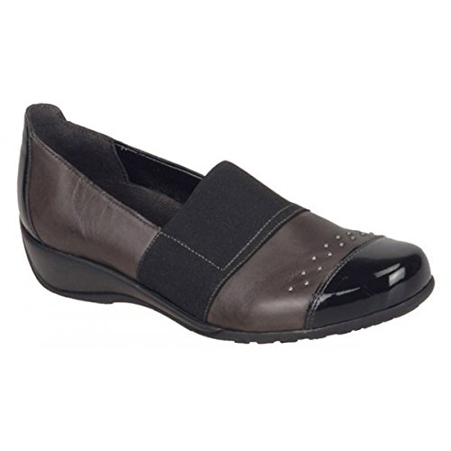 Intricately finished, the Dorndorf Lagro ladies shoes are a wide -fitting pair in a choice of black or bordo red leathers. With a patent toe cap and elasticated vamp, these versatile loafers stand on a low, supportive wedged heel with rubber soles offering excellent traction. Inside, leather and textile linings make a comfy environment for feet, with removable footbeds allowing orthotics to be inserted in place. Finished with stud detailing across the toe, the Dorndorf Lagro slip on shoes are ideal for everyday work or weekend wear.